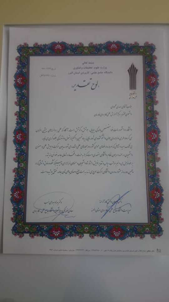 به گزارش روابط عمومی واحد استانی دانشگاه : مراسم اختتامیه پنجمین جشنواره درون دانشگاهی حرکت ویژه دستاورد های انجمن های علمی دانشجویی دانشگاه علمی کابردی به میزبانی استان البرز برگزار گردید . آقای مهدی محمودی دانشجوی رشته فناوری اطلاعات مرکز آموزش علمی کاربردی فارسان در بخش پژوهشی جشنواره با ارائه طرح ( رده بندی بازی های رایانه ای با استفاده از منطق فازی) موفق به کسب عنوان برتر شد.